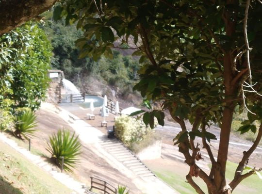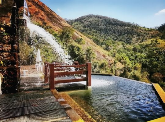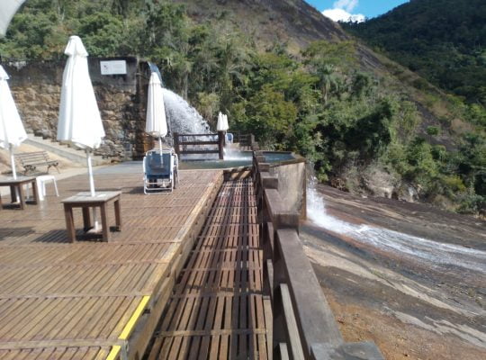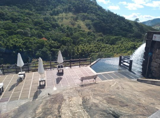 Construção de piscina natural de borda infinita em estrutura de concreto ancorada em maciço rochoso, e deque em madeira.